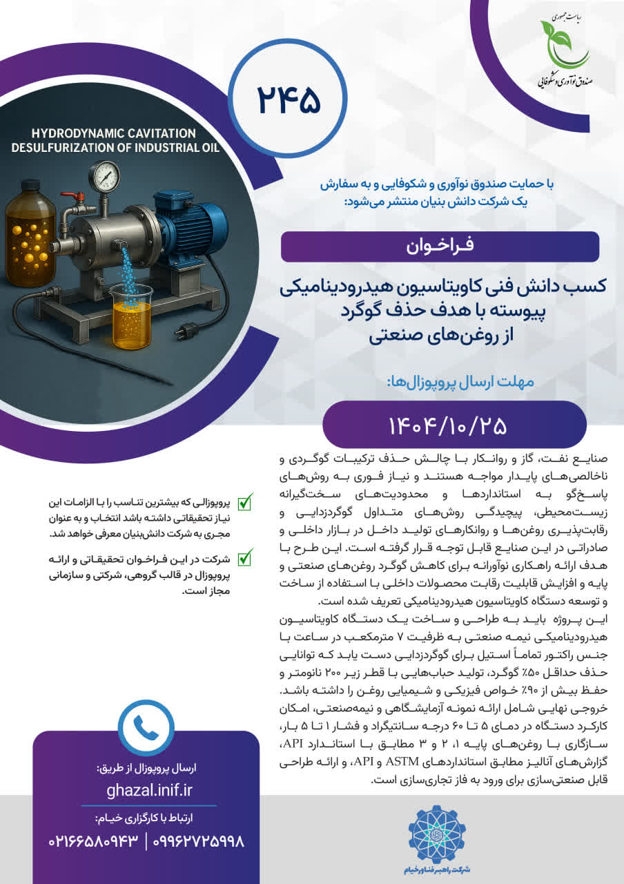 فراخوان کسب دانش فنی کاویتاسیون هیدرودینامیکی پیوسته با هدف حذف گوگرد از روغنهای صنعتی