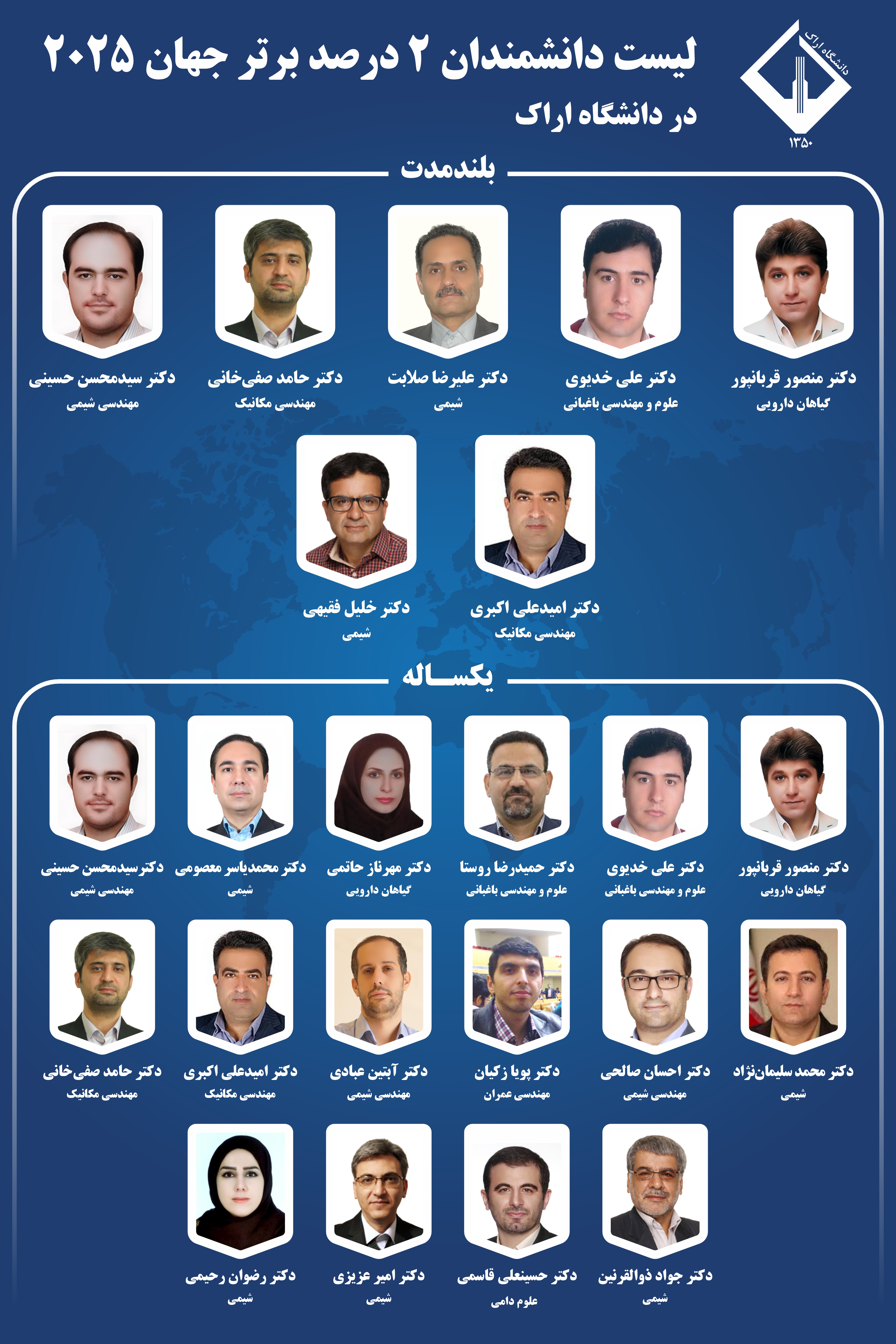همچنین با افتخار اعلام می‌شود که دانشکده‌های دانشگاه اراک با کسب جایگاه در فهرست دانشمندان دو درصد برتر جهان، جایگاه ممتاز خود در عرصه‌ی تولید علم را تثبیت نمودند. بر این اساس، دانشکده علوم پایه با حضور هفت پژوهشگر، دانشکده فنی و مهندسی با حضور شش پژوهشگر، و دانشکده کشاورزی و محیط زیست با حضور پنچ پژوهشگر سهمی ارزشمند در این موفقیت بزرگ علمی داشته‌اند. لذا ‌سهم‌ دانشکده‌ها، گویای تعالی و توازن کیفی در گستره‌ی وسیعی از حوزه‌های علمی در دانشگاه اراک می‌باشد.